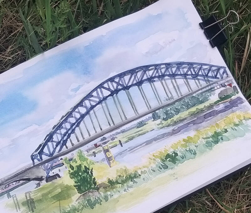 1. op zoek naar een plek. Ik wist dat ik een schilderij van de IJsselbrug wilde maken deze zomer. Ik was op de fiets gestapt en ben geschikte locaties rondom de brug gaan zoeken. Aan de ene kant had je veel lawaai van een tractor en had ik geen vrij zicht, aan de andere kant keek ik tegen het zonlicht in. Uiteindelijk ben aan de oostzijde gaan zitten op een heuveltje, zodat ik de hele brug kon zien.