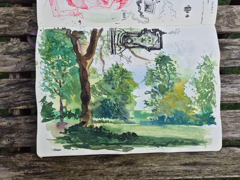 Dit gevoel bleef me parten spelen in de zomer. Het was natuurlijk enorm regenachtig in 2023 en daardoor kon ik niet of nauwelijks buiten werken. Toch wil ik een zelfde aquarel als deze, ooit weer opnieuw maken. Ik geloof er heilig in dat elke mislukte tekening er één is om te koesteren en er een moment komt dat je net zoveel kunt genieten van een goeie tekening als dat je kunt balen van een slechte.