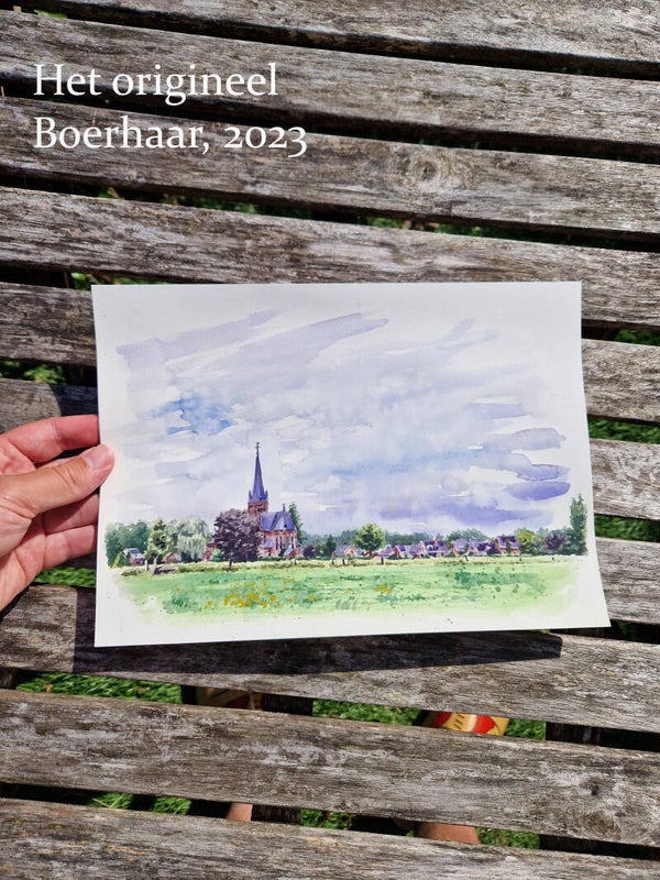 Boerhaar is een pittoresk dorp met slechts 200 inwoners in de gemeente Olst-Wijhe. Het dorp ligt aan de Soestwetering. Ik heb Boerhaar hier geschilderd op een bewolkte dag in de zomer. In de verte zie je de Heilige Willibrorduskerk boven de andere huizen uittorenen.