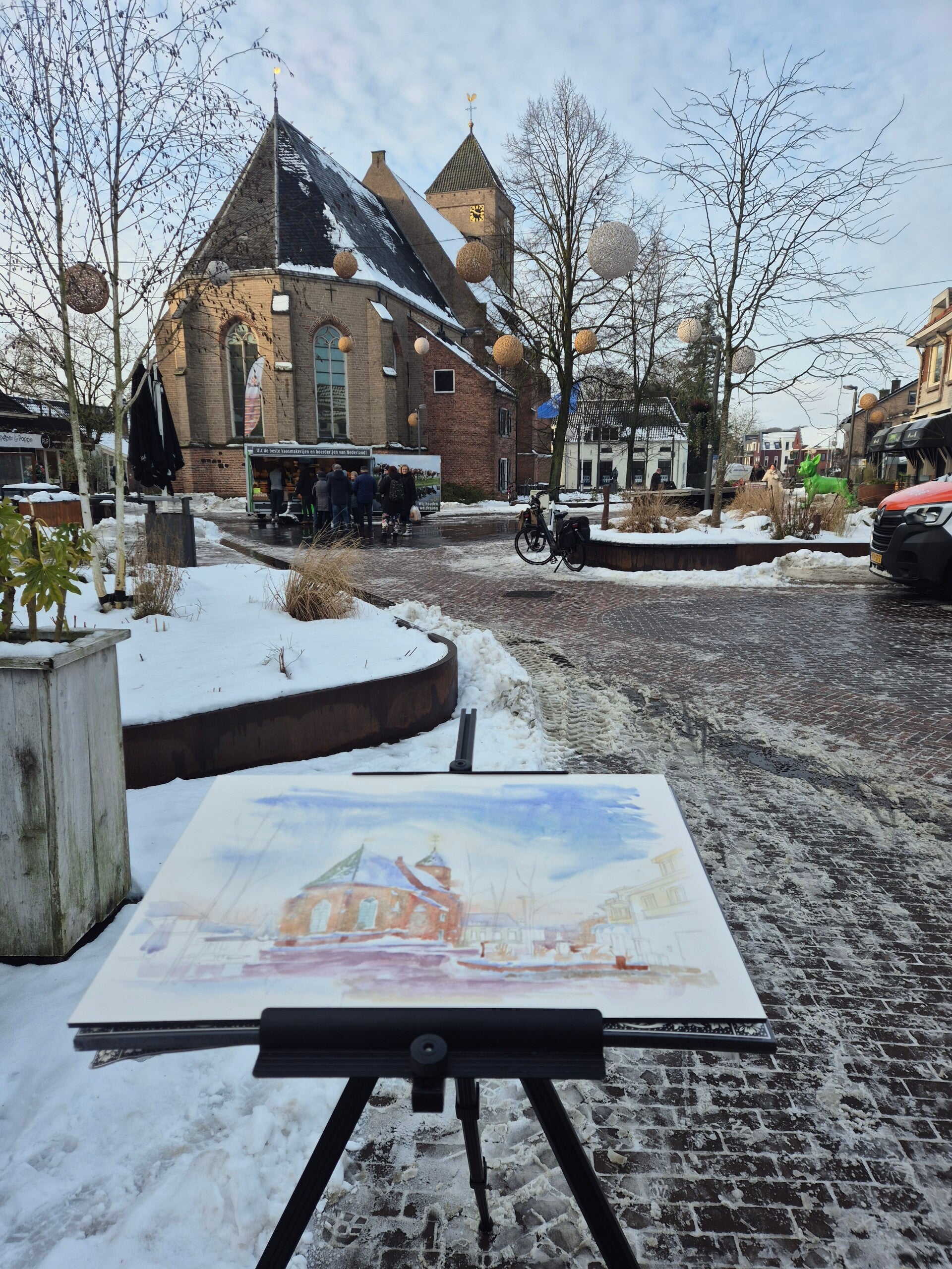 Raalte is een dorp in het hart van het Salland. Ik heb dit schilderij midden in het centrum gemaakt, toen er veel sneeuw was gevallen, maar de dooi net was ingezet. Centraal staat de Plaskerk, een oude middeleeuwse kerk, die tegenwoordig vaak voor evenementen in Raalte wordt gebruikt.